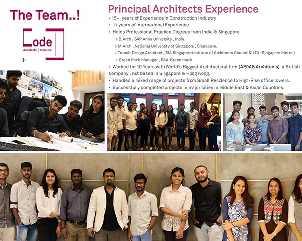 Code-D Architects began in 2015, under the leadership of Architect Dhileep. He Graduated from School of Architecture & Planning (SAP), Anna University, Chennai. Ar Dhileep Started working with Aedas Architects in Singapore , which is one of the world’s biggest Architecture Firm Globally. Completing his 7 years of international work experience with Aedas Architects-Singapore, he detached himself to start his own Office in Chennai, INDIA. Adding value to this Organisation,